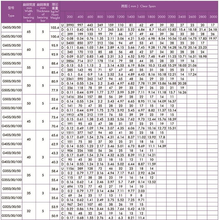 工字型扁鋼中心距為30常用格柵板規(guī)格型號及安全荷載表