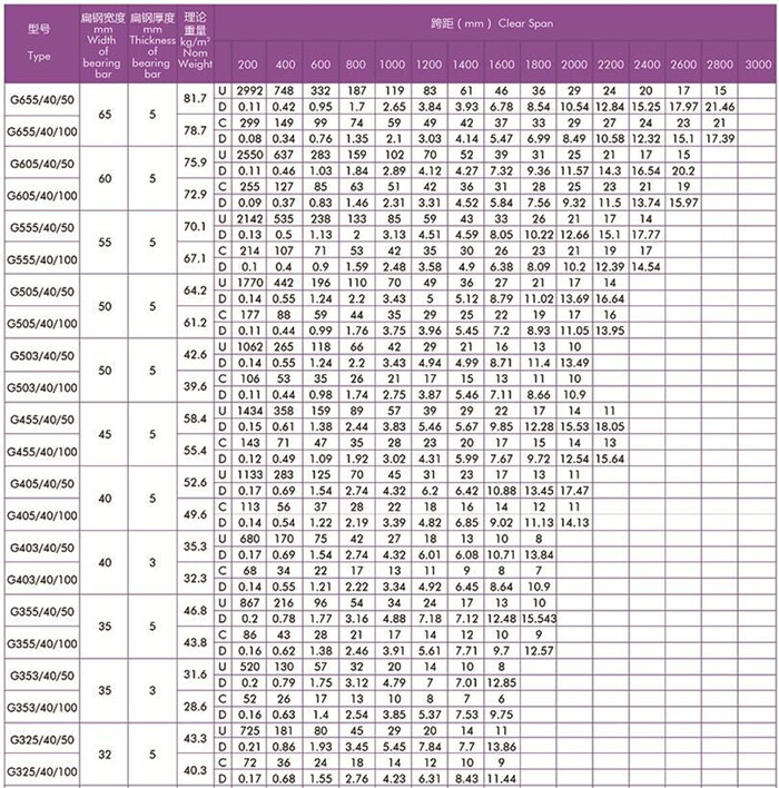 平面型扁鋼中心距為40常用鋼格柵板規(guī)格型號及安全荷載表